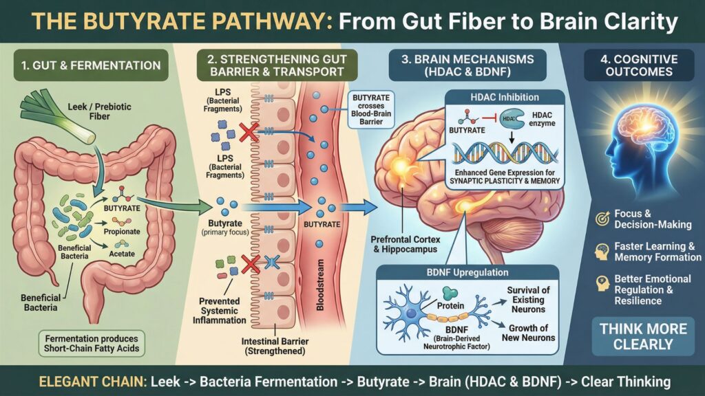 The chain is remarkably elegant. You eat a leek. Bacteria in your colon ferment the inulin in that leek. They produce butyrate. Butyrate crosses into your brain. Your brain makes more BDNF. You think more clearly. It sounds almost too simple, but the biochemistry holds up across dozens of published studies.